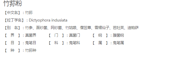竹荪(Dictyophora indusiata)又名竹笙、竹参,泛指鬼笔目鬼笔科鬼笔属(Phallus)的物种,是寄生在枯竹根部的一类菌物,原属于竹荪属后更改到鬼笔属。常被被人们称为“雪裙仙子”、“山珍之花”、“真菌之花”、“菌中皇后”。是寄生在枯竹根部的一种隐花菌类,形状略似网状干白蛇皮,它有深绿色的菌帽,雪白色的圆柱状的菌柄,粉红色的蛋形菌托,在菌柄顶端有一围细致洁白的网状裙从菌盖向下铺开,被人们称为“雪裙仙子”、“山珍之花”、“真菌之花”、“菌中皇后”。