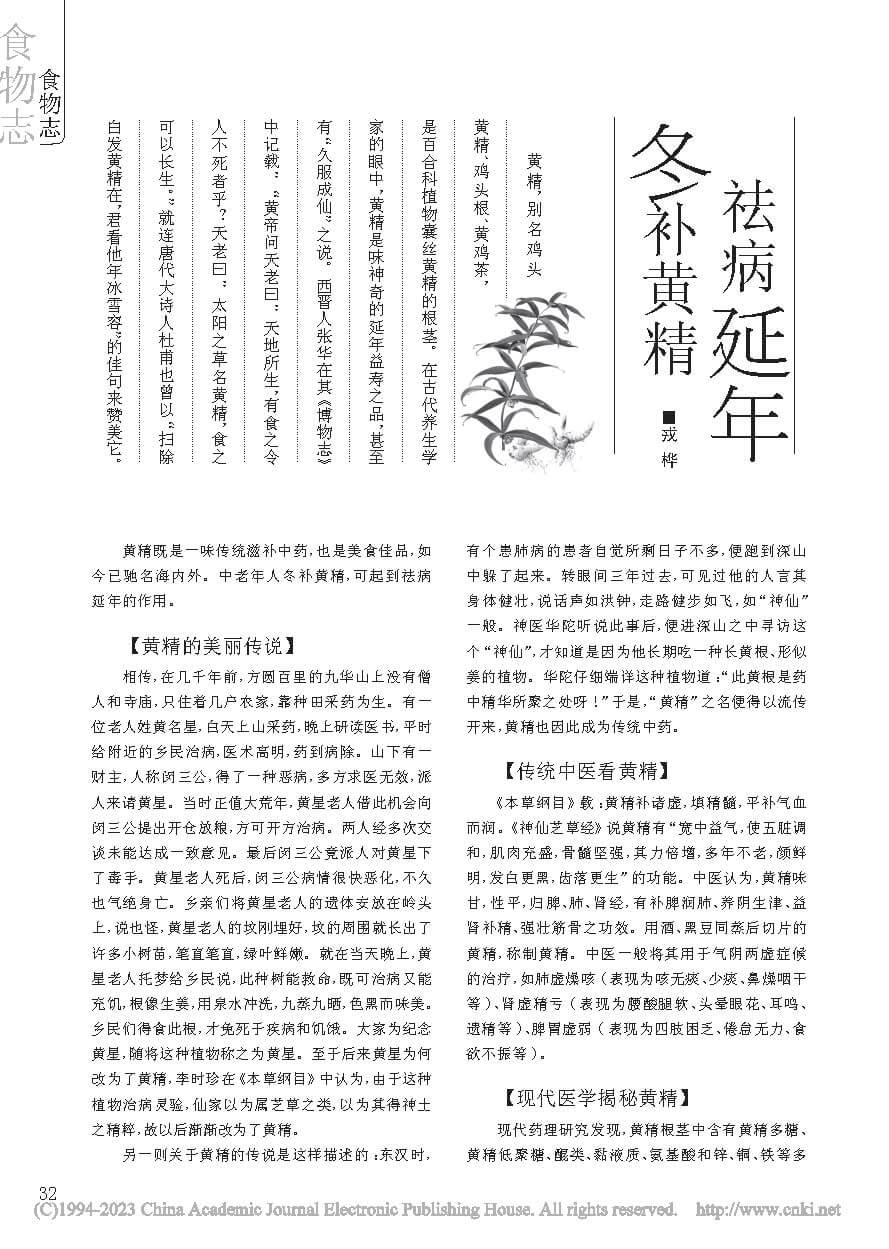 黄精:医用记载始于《名医别录》,《名医别录》(220-450年)曾记载:“黄精,味甘,平,无毒。主补中益气,除风湿,安五脏。性平,味甘,归脾、肺、肾经。2002年2月28日卫生部发布《关于进一步规范保健食品原料管理的通知》(卫法监发〔2002〕51号),确定黄精列入既是食品又是药品的物品名单。