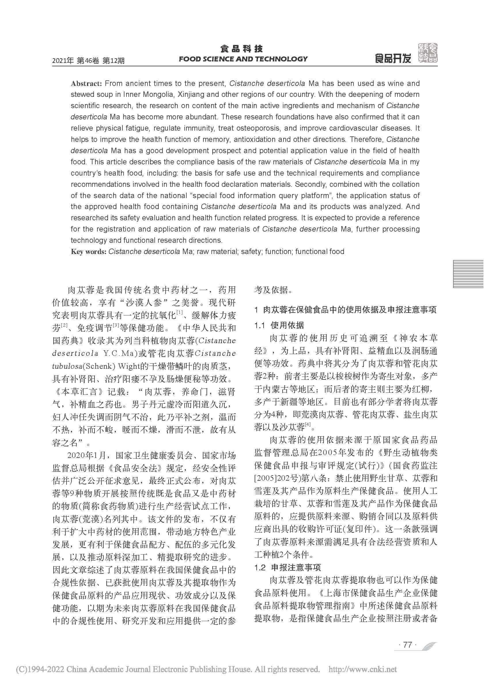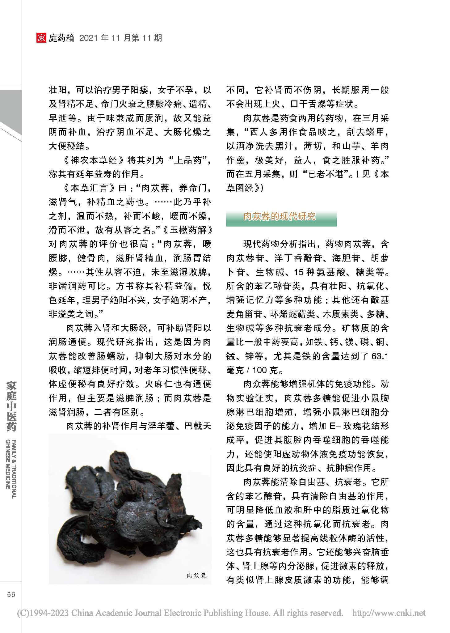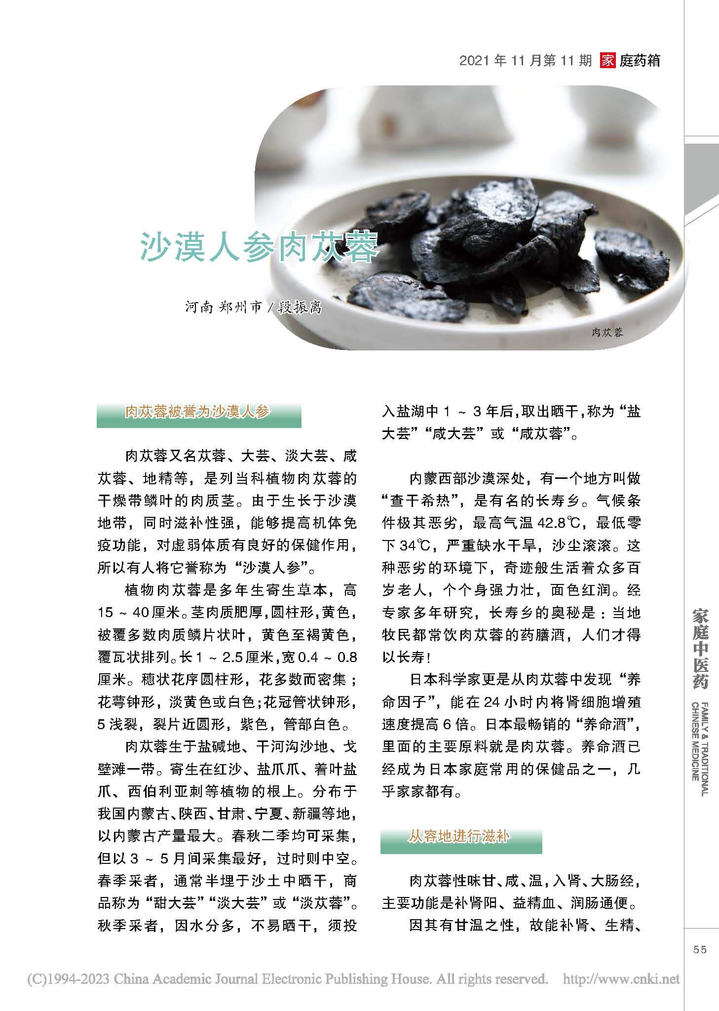 肉苁蓉:始载于《神农本草经》,《本草纲目》草部·肉苁蓉载明:气味甘、微温、无毒。主治劳伤,精败面黑。因是肉质植物,药性从容和缓,故名肉苁蓉。2023年11月9日,国家卫生健康委、国家市场监管总局发布根据《中华人民共和国食品安全法》及其实施条例、《按照传统既是食品又是中药材的物质目录管理规定》,经安全性评估及试点生产经营,现将党参、肉苁蓉(荒漠)、铁皮石斛、西洋参、黄芪、灵芝、山茱萸、天麻、杜仲叶等9种物质纳入按照传统既是食品又是中药材的物质目录。