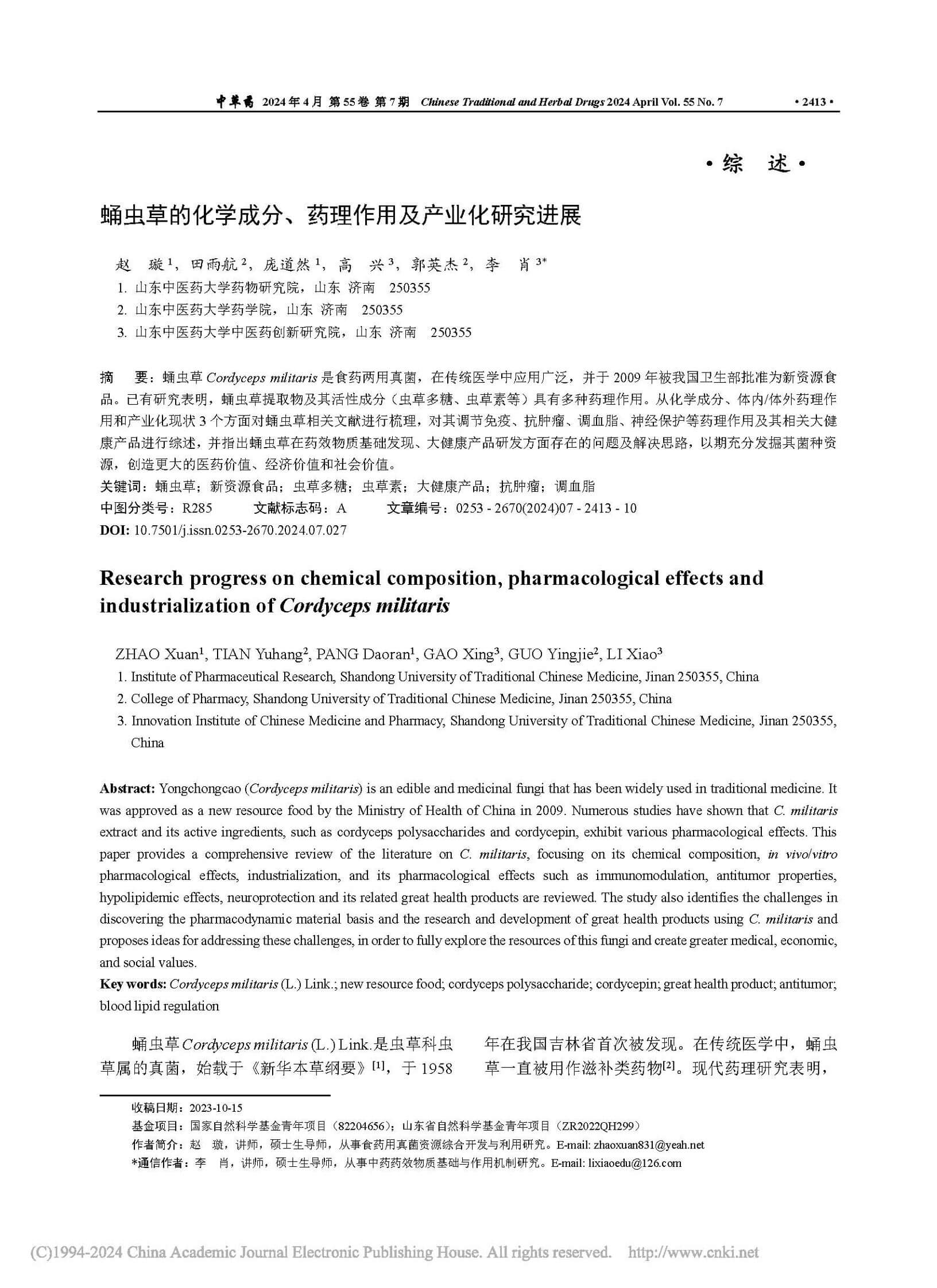 蛹虫草(虫草花): 性平,味甘,归肺、肾经。蛹虫草始载于《新华本草纲要》,于1958年在我国吉林被首次发现的,并于2009年被我国卫生部批准为新资源食品,是目前唯一被批准的虫草属真菌。是食药两用真菌,其蛋白质含量高达40.7%,其中所含人体必需的氨基酸不仅种类齐全,数量充足,而且比例适当。