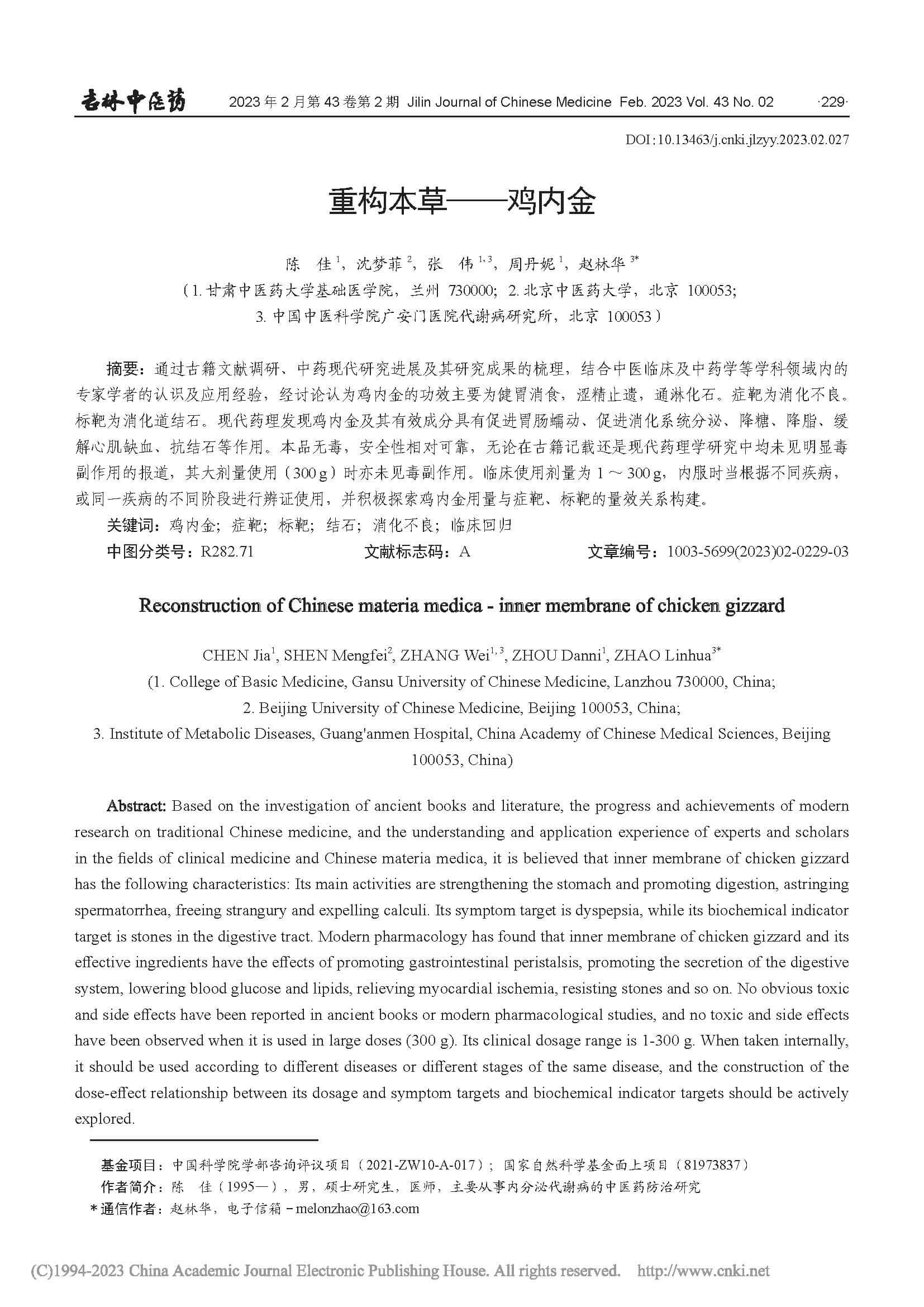 鸡内金:中药名。为雉科动物家鸡Gallusgallusdomesticus Brisson的干燥砂囊内壁。杀鸡后,取出鸡肫,立即剥下内壁,洗净,干燥。《本草纲目》中记载鸡内金:性味:甘,平,无毒。归经:主要归脾、胃、小肠、膀胱经。李时珍在《本草纲目》中对鸡内金的记载,奠定了它作为一味“消食化石要药”的地位。它药性平和,集“消导”与“固涩”两种看似矛盾的功效于一身,既能消食化积、通淋化石,又能涩精止遗,体现了中医中药的奇妙之处。2002年2月28日卫生部发布《关于进一步规范保健食品原料管理的通知》(卫法监发〔2002〕51号),确定丁香等87种既是食品又是药品的物品名单,明确将鸡内金列入其中。
