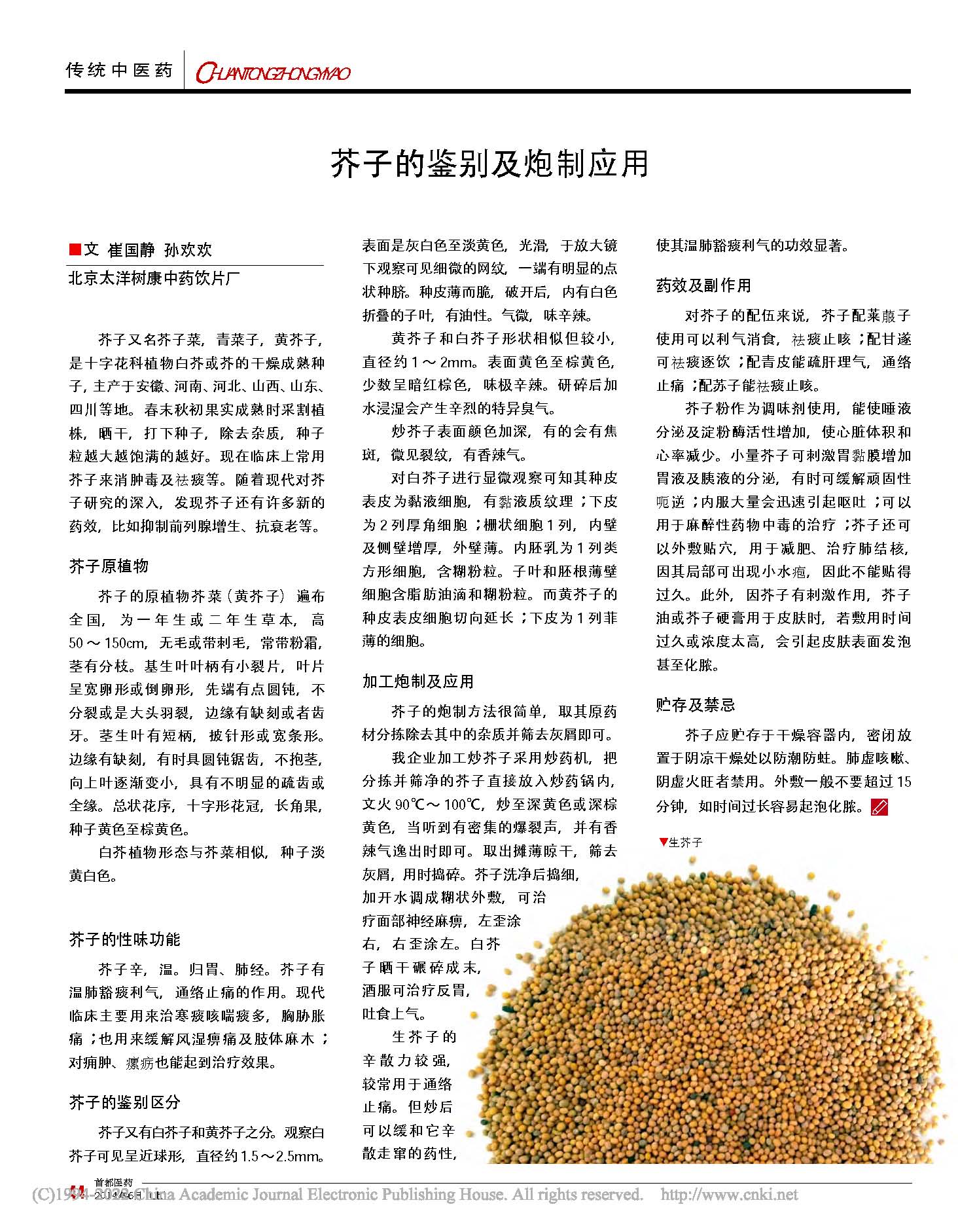 黄芥子一般指芥菜籽,为十字花科(Cruciferae)芸苔属植物的种子,其种类有黑芥籽、黄芥籽和白芥籽、褐芥籽等三种。传统医学认为:芥菜籽性味辛温,入肺、胃经。功擅利气豁痰、温中散寒、通络止痛,常用于治疗痰饮咳喘、胸胁胀满疼痛、四肢麻木、关节疼痛、阴疽肿毒等病。《本草纲目》记载历代医家常用之治疗常见病及顽痰怪症。2002年2月28日卫生部发布《关于进一步规范保健食品原料管理的通知》(卫法监发〔2002〕51号),确定黄芥子列入既是食品又是药品的物品名单。