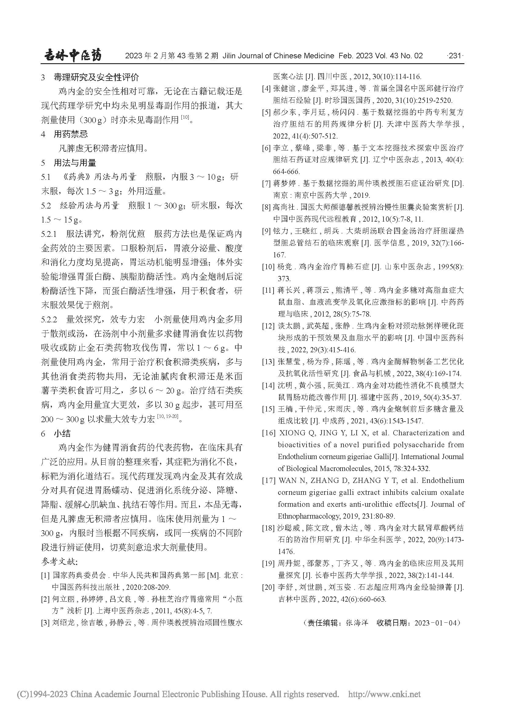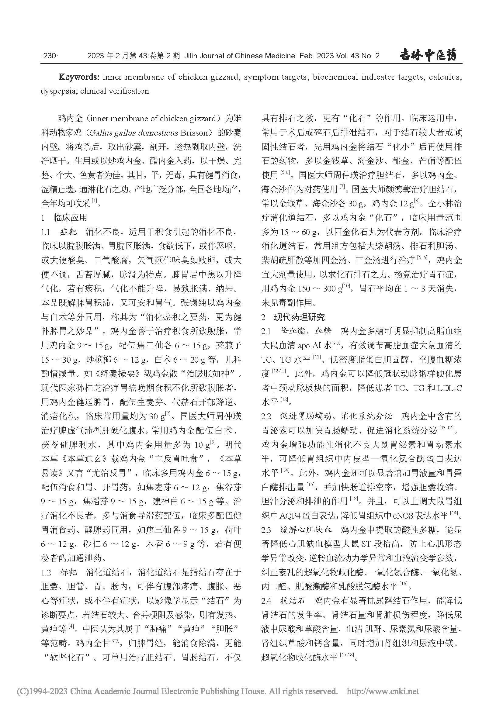 鸡内金,中药名。为雉科动物家鸡Gallusgallusdomesticus Brisson的干燥砂囊内壁。杀鸡后,取出鸡肫,立即剥下内壁,洗净,干燥。《本草纲目》中记载鸡内金:性味:甘,平,无毒。归经:主要归脾、胃、小肠、膀胱经。李时珍在《本草纲目》中对鸡内金的记载,奠定了它作为一味“消食化石要药”的地位。它药性平和,集“消导”与“固涩”两种看似矛盾的功效于一身,既能消食化积、通淋化石,又能涩精止遗,体现了中医中药的奇妙之处。2002年2月28日卫生部发布《关于进一步规范保健食品原料管理的通知》(卫法监发〔2002〕51号),确定丁香等87种既是食品又是药品的物品名单,明确将鸡内金列入其中。