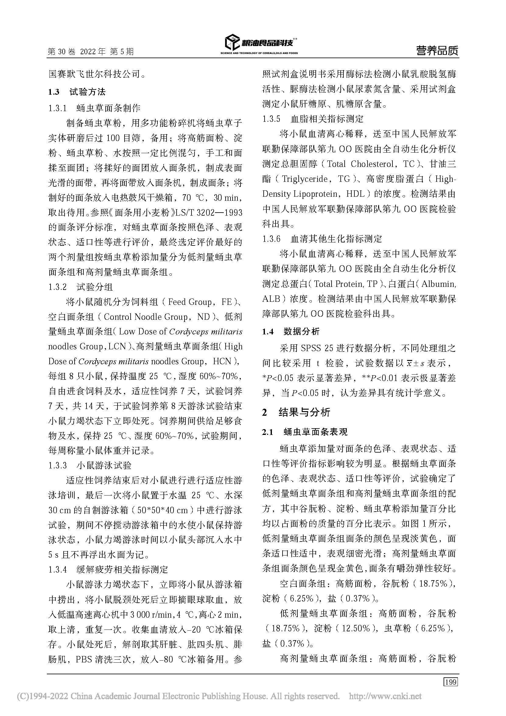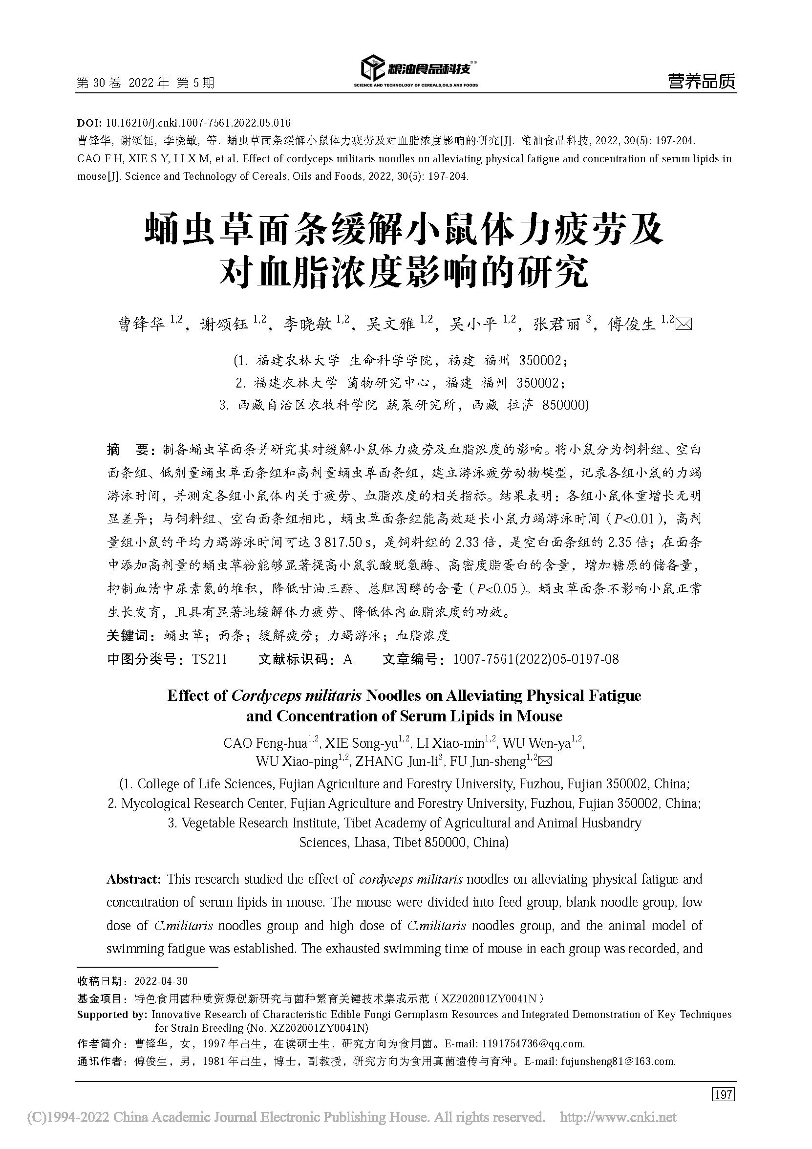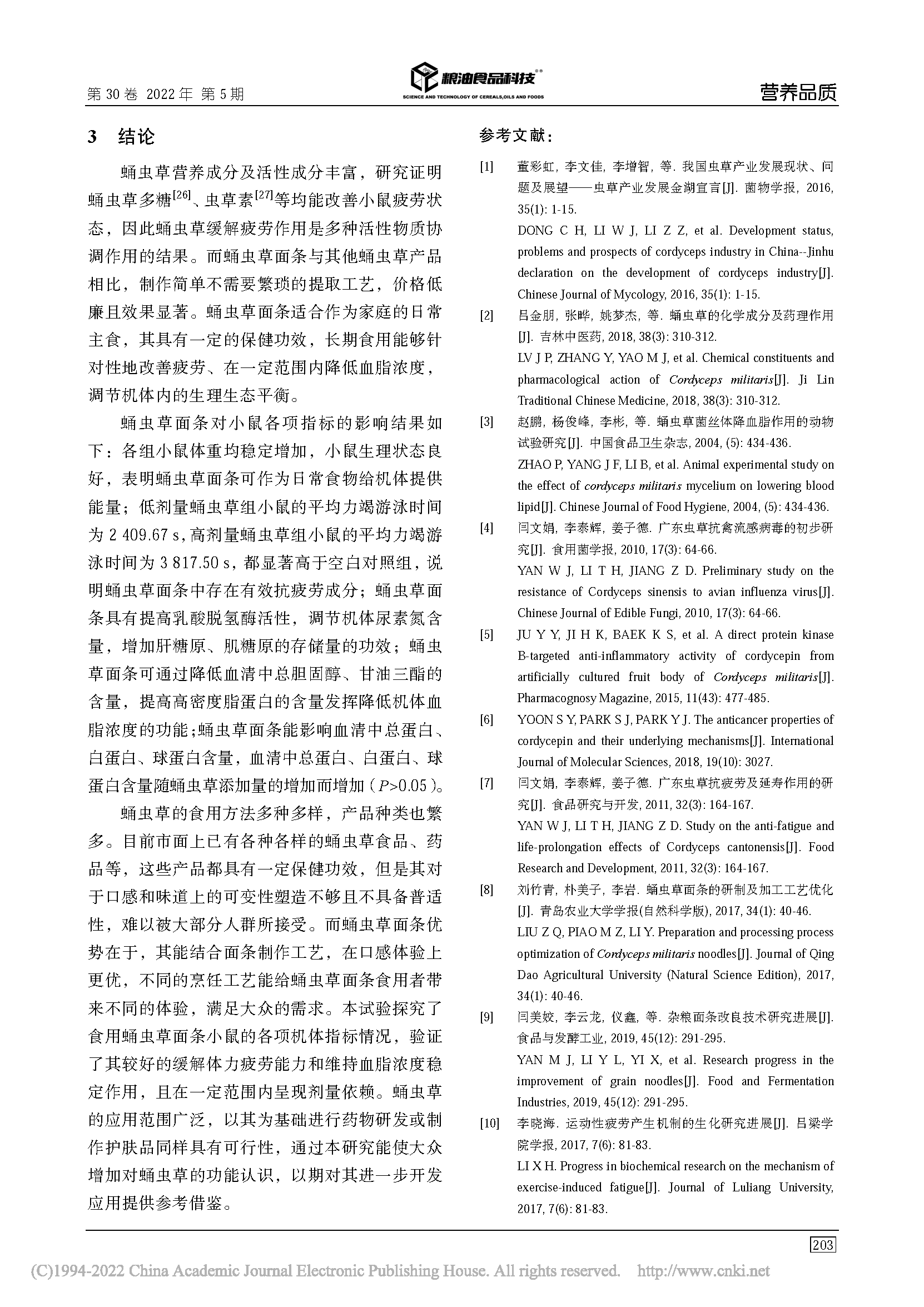 10、《蛹虫草面条缓解小鼠体力疲劳及对血脂浓度影响的研究》