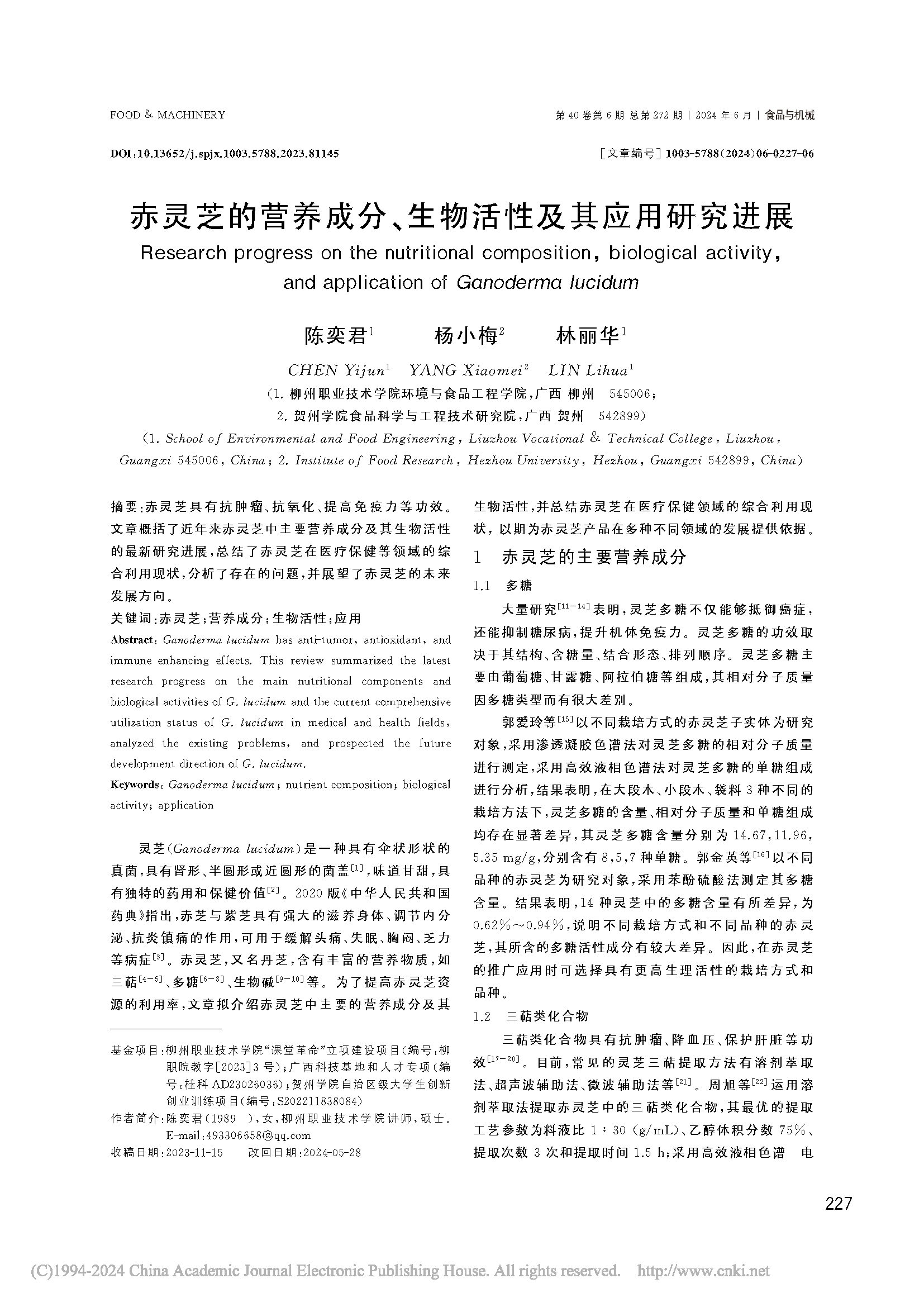 13、《食品与机械-赤灵芝的营养成分、生物活性及其应用研究进展》